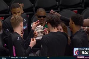 “聚众狂欢”!热火众将围在一起碰杯电解质 随后头仰天一饮而尽