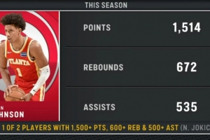 本赛季仅两人达成至少1500分600板500助:杰伦·约翰逊 约基奇
