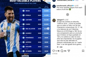 阿根廷历史身价排行:梅西1.8亿欧第一,恩佐第7迪马利亚第10