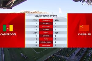 国足vs喀麦隆半场数据:国足2次射门0射正,喀麦隆7射4正进2球