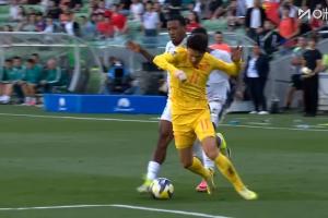 林良铭断球突破造黄牌+任意球!喀麦隆队长查丘瓦从身后犯规