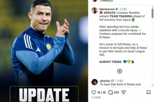 罗马诺在社交媒体上这样写道:“最新:C罗恢复球队合练,距离伤愈复出一步之遥。在因肌肉伤势缺阵长达四周后,C罗正在积极备战,准备重返赛场为利雅得胜利效力。”