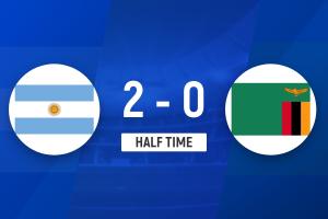 上半场补时1分钟,阿根廷2-0赞比亚。