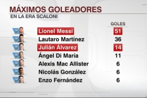 斯卡洛尼执教下阿根廷队进球榜:梅西51球第一,阿尔瓦雷斯第三