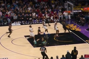 老头冲得真快!詹姆斯疾速推反击 背后击地妙传拉拉维亚停顿上篮