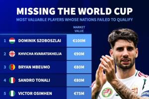 体育资讯04月01日讯 世界杯48支球队今日全部出炉,德转统计了无缘今年世界杯的球员身价榜,索博斯洛伊1亿欧居首,意大利4人上榜。