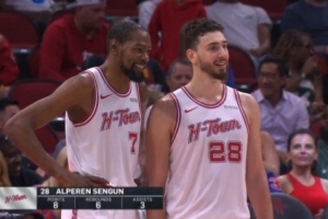 气氛很对!杜兰特和申京在场上微笑交流 随后马上投入防守