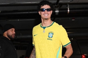 在勇士客场对阵马刺的比赛之前,效力于勇士队的巴西球员吉·桑托斯身穿巴西国家队球衣抵达现场,表达对桑巴军团的支持。