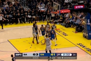 这么放?文班亚马面对追梦虚晃后中投得手 后者站着没动