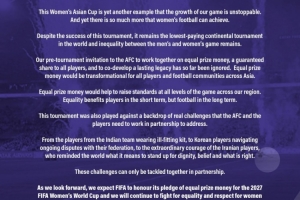 赛前我们邀请亚足联共同合作,争取奖金平等、球员待遇同等,共同发展一笔可持续的财富,但至今未得到回应。奖金平等将对全亚洲的球员和足球社区产生变革性的影响。