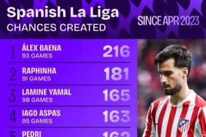 亚马尔西甲首秀以来创造165次机会,仅少于巴埃纳、拉菲尼亚
