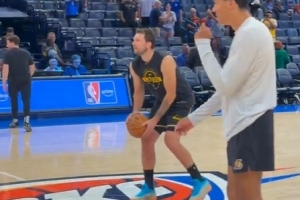 常规操作!东契奇赛前踩着Logo 两记中场超远三分连续命中