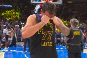 捂着腿筋!东契奇突破痛苦倒地双手掩面非常难受返回更衣室