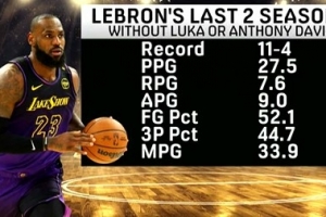 过去两季在东契奇或AD缺阵时 詹姆斯场均27.5分7.6板9助 11胜4负