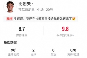 比朔夫本场数据:5射3正进2球+1错失进球+3关键传球 获评8.7分