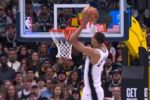 轻松平筐!卡斯尔抛传高空制导 文班随便起飞双手空接炸扣!