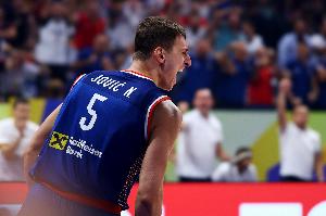 上半场比赛中,塞尔维亚球员约维奇出战12分43秒,投篮6中4,三分3中2,罚球2中2,得到12分(皆来自首节)3板5助1断,正负值+25与约基奇并列半场最高。