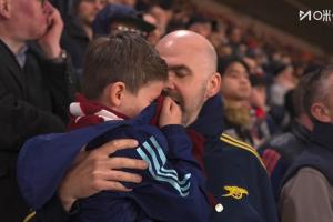 当谢赫·查尔斯攻入绝杀球后,球场看台上的球迷呈现出两种极端情绪,圣徒球迷兴奋狂喜,而镜头则拍到有阿森纳小球迷拿衣服抹眼泪,父亲赶忙送上拥抱和安慰。