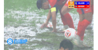 猛刨!佛山主场草地积水严重,波佩斯库罚点前球员们在点球点清水