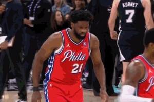 没好利索?恩比德中投命中 之后摇头并不断活动膝盖
