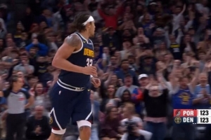很稳健!阿隆·戈登底角接球三分命中 掘金最后1分钟追平比分