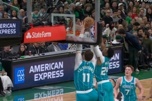 抢着吃饼!克尼佩尔抛传米勒与卡尔克布伦纳同时起跳完成空接得分