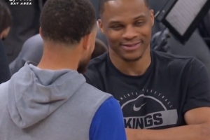 聊啥呢~勇士VS国王 赛前库里和威少寒暄 两人有说有笑