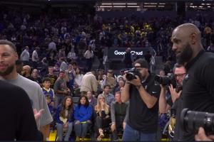 库里专注唠嗑 詹姆斯在一旁耐心等待随后温情相拥