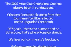 体育资讯04月10日讯 此前C罗生涯总进球数的争议持续引起讨论,C罗本人也在社媒以评论做了表态。球迷反馈称sofascore找不到C罗阿拉冠的进球,如今sofascore如今发布公告做出回应。