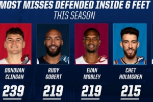 6英尺内防守致对手投丢次数榜:克林根239球第1 戈贝尔莫布里前三