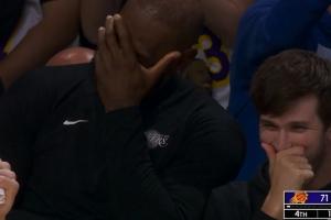 在说什么悄悄话?詹姆斯捂脸和里夫斯咯咯咯笑得合不拢嘴