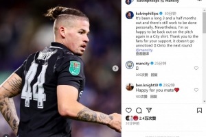 菲利普斯社媒:很高兴身披曼城球衣重返赛场,感谢大家的支持