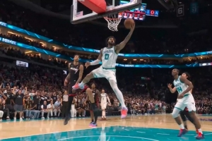 这滞空逆天!布里奇斯超远距离滑翔拉杆换手上篮 黄蜂领先5分!