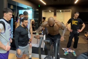 体育资讯4月16日讯 今日,湖人官推晒出一段詹姆斯带领全队疯狂蹬车训练体能备战季后赛的片段。