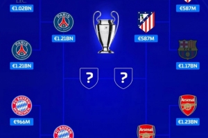 欧冠四强身价:阿森纳、巴黎均超12亿欧,拜仁9.66亿、马竞5.87亿