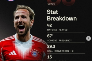 凯恩赛季50球具体数据:每67分钟一球,射门转化率29%,6粒远射