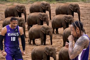 德罗赞愿帮威少跟大象打架哈登:我爱你们!但我先撤!