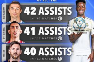 维尼修斯升第5!欧冠历史助攻榜:C罗、天使、梅西前三 内马尔第4