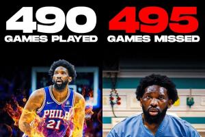 大帝躺着赚钱?恩比德生涯至今出战490场常规赛 缺席了495场比赛