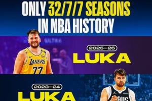 仅两名球员打出过赛季场均32+7+7:东契奇3次、乔丹1次