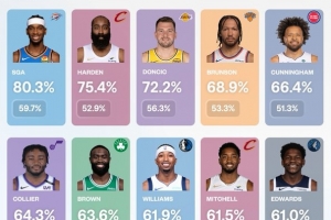 亚历山大本赛季进球非助攻率80.3%联盟第一 哈登75.4%第二