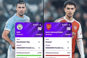 罗德里(曼城):传球成功率90.10%,向前传球24.3次,抢断2.5次,争顶成功率77.78%,成功对抗6.6次,地面对抗成功率61.06%,解围2.4次,拦截0.9次,夺回球权6.5次