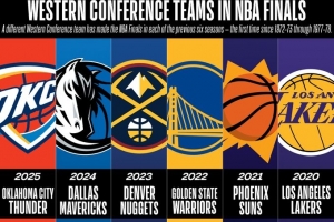 今年呢?过去6个赛季每年都是不同西部球队打进总决赛
