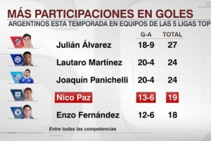 据ESPN统计,尼科·帕斯是本赛季参与进球第四多的五大联赛阿根廷球员。