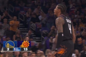 这么大空位!?杰伦·格林45°三分命中 太阳13-0攻击波打停勇士