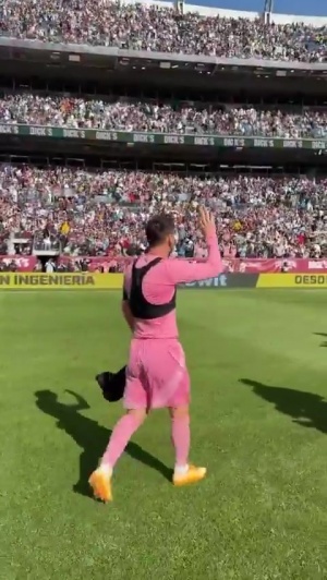美职联官方晒出视频,梅西换完球衣离场时对着看台打招呼,现场的球迷也非常热情。