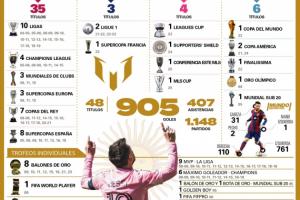 1148场905球407助,制造进球1312球,拿下48冠。其中迈阿密生涯97场85球43助,拿下4冠。