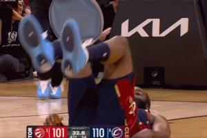 登哥咱年纪大了省省吧!哈登倒地后想鲤鱼打挺 想了想放弃了