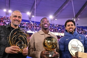 巴黎晒恩里克、登贝莱、马尔基尼奥斯+三奖项合影:集体的力量