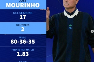 穆里尼奥执教生涯欧冠战绩:17个赛季2次夺冠,场均积分1.83分